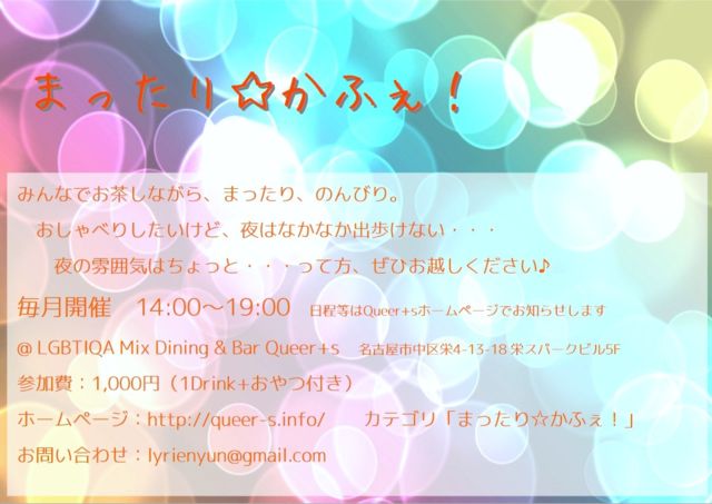 ¡Ö¤Þ¤Ã¤¿¤ê¡ù¤«¤Õ¤§¡ª¡×act.38 ¤ß¤ó¤Ê¤Ç¤ªÃ㤷¤Ê¤¬¤é¡¤¤Þ¤Ã¤¿¤ê¡¤¤Î¤ó¤Ó¤ê¤·¤Þ¤·¤ç¢ö Date / Æü»þ 11·î20Æü(Æü)14»þ¡Á19»þ ¤â¤Á¤í¤ó¡¢ÅÓÃæ¤«¤é¤Î»²²Ã¤äÅÓÃæÈ´¤±¤âOK¤Ç¤¹¡ù Entrance Fee / »²²ÃÈñ 1,000±ß¡Ê1Drink¡Ü¤ª¤ä¤ÄÉÕ¤¡Ë Description / ³µÍ× °ÛÀÁõ¼Ô¤µ¤ó¡¤¥È¥é¥ó¥¹¥¸¥§¥ó¥À¡¼¤µ¤ó¤Ë¤«¤®¤é¤º¡¤ ¤Ê¤ó¤È¤Ê¤¯°ãÏ´¶¤¢¤ë¤Ê¡¼¤Ã¤ÆÊý¤äǺ¤ó¤Ç¤ëÊý¡¤ °ÛÀÁõ¤·¤¿¤¤¤±¤É¤Ê¤«¤Ê¤«¤Ç¤¤Ê¤¤Êý¡¤ °ÛÀÁõ¼Ô¤µ¤ó¤¬¹¥¤¤ÊÊý¡¤ ¤È¤ê¤¢¤¨¤º¤Þ¤Ã¤¿¤ê¤À¤é¤À¤é¤·¤¿¤¤Êý¤Ê¤É¡¤ ¤µ¤Þ¤¶¤Þ¤ÊÊý¤È¤Þ¤Ã¤¿¤ê¤À¤é¤À¤é²á¤´¤¹¥¤¥Ù¥ó¥È¤Ç¤¹¡£ Con