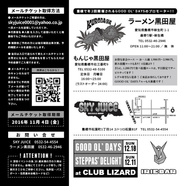 -¹õÅIJ° & SKY JUICE & IRIE ENTERTAINMENT Presents- ¡ÖGOOD OL' DAYS¡× ¡ÉPLAYING THE VERY BEST IN REGGAE¡É <³«ºÅÆü»þ> 2016ǯ11·î5Æü(ÅÚ) OPEN/22:00 <²ñ¾ì> SKY JUICE °¦Ãθ©Ë¶¶»Ô¾¾ÍÕÄ®1-14 B1 0532-54-4554 <ÎÁ¶â> Mail Ticket:2,000yen(1DÉÕ) Door:2,500yen(1DÉÕ) Mail Ticket Adress : skyjuice0001@yahoo.co.jp ¢¨¥á¡¼¥ë¥Á¥±¥Ã¥È¼èÆÀ´ü¸Â¡§2016ǯ11·î4Æü(¶â) <½Ð±é> ¡¦COJIE¡¡from MIGHTY CROWN ¡¦YOYO-C from JUKE BOX ¡¦SOLID GROUND ¡¦BULL HITTER <½ÐŹ¥Ö¡¼¥¹> ¥é¥¬