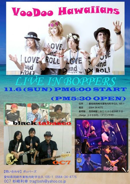 VooDoo Hawaiians Live in Boppers 2016.11.6 (SUN) OPEN PM5:30 START PM6:00 Charge \3000 1¥É¥ê¥ó¥¯ÉÕ¤ ¡ù¡¡VooDoo hawaiians ¡ù¡¡Black Tabasco ¡ù¡¡Re¡ùæ ¡ù¡¡OC7 ¥Á¥±¥Ã¥È¸ÂÄê¤Ç¤¹¤Î¤Ç¤ªÁá¤á¤Ë¤ª´ê¤¤¤·¤Þ¤¹¡ª