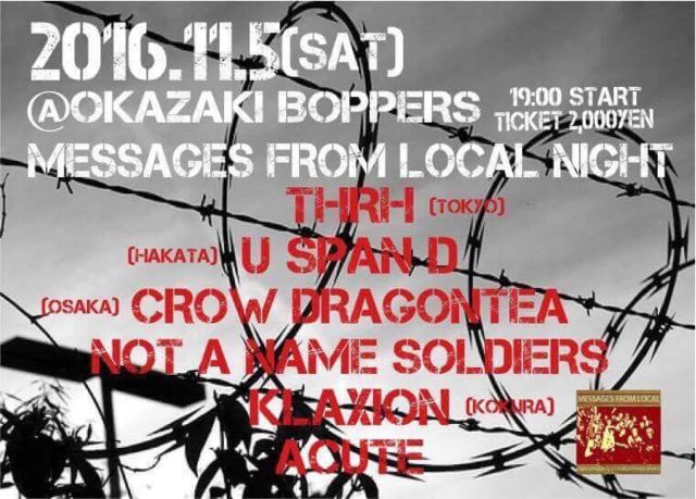 MESSAGES FROM LOCAL NIGHT 2016.11.5 (SAT) 19:00 START TICKET \2000 ¡ù¡¡THRH (TOKYO) ¡ù¡¡U SPAND (HAKATA) ¡ù¡¡CROW DRAGONTEA (OSAKA) ¡ù¡¡NOT A NAME SOLDIERS ¡ù¡¡KLAXION (KOKURA) ¡ù¡¡ACUTE