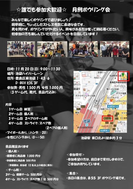 みんなで楽しくボウリングで遊びましょう (^O^)/ 朝、早朝にちょっとしたストレス発散に最適な会です。 男女問わず、ボウリングがやりたい人、興味がある方は奮って御応募ください。 初参加の方も楽しんでいただけるイベントを目指しています。♪ 日時 11月20日(日) 9:00〜11:30 場所 ハイパーレーン 住所 豊島区東池袋1-43-6 D-BOXビル3F 集合 8:55 現地ボウリング場 3F受付 アクセス 池袋駅 東北口から徒歩3分 募集期限 前日まで受付 参加費 男性1,500円 女性1,000円 (3ゲーム代、靴代、景品代込み) 1ゲーム