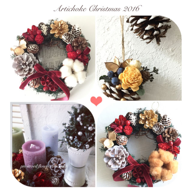 世田谷区八幡山にあるプリザーブドフラワー教室 アーティチョークです。 今年はクリスマスリースを自分で作ってみたい方! ワークショップを開催します。 このような方はぜひご参加ください!! ・ リースを手作りしてみたい方 ・市販では買えないリースを作りたい方 ・オリジナルリースを作りたい方 ・興味はあるけど、1人参加はちょっと不安な方 グルーでつけていく簡単なリースなので 手先に自信のない方でも、楽しくリースが制作できます♪ 写真はイメージなります。 写真と同じ物も作れますし、 お好きな色