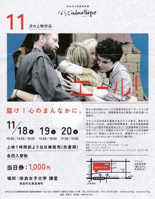 11·î¤Î¤Ê¤é¥·¥Í¥Þ¥Æ¡¼¥¯¤Ï¡Ö¥¨¡¼¥ë¡ª¡×¤ò¾å±Ç¤·¤Þ¤¹¡£ ²Î¤ÎºÍǽ¤òǧ¤á¤é¤ì¡¢¥Ñ¥ê¤Î²»³Ú³Ø¹»¤Ø¤Î¿Ê³Ø¤òÁ¦¤á¤é¤ì¤¿¾¯½÷¤È¡¢Ä°³Ð¾ã³²¤Î¤¢¤ë²È²¤Îʪ¸ì¡£¾ã³²¤Î¤¢¤ëξ¿Æ¤¬µ¤¤¬¤«¤ê¤Ê¾¯½÷¤ÎÈÑÌå¤È²È²¤Î°¦¤¬¥Æ¡¼¥Þ¤Î´¶Æ°ºî¤Ç¤¹¡£ ¥¨¥ê¥Ã¥¯¡¦¥é¥ë¥Æ¥£¥´´ÆÆÄ¡¢ÆüËܤǤÏ2015ǯ¸ø³«¤ÎºîÉʤǤ¹¡£¤ª³Ú¤·¤ß¤Ë¡£ 11·î18Æü¡Ê¶â¡Ë10¡§00¡¿14¡§00¡¿19¡§00 11·î19Æü¡ÊÅÚ¡Ë14¡§00¡¿18¡§00 11·î20Æü¡ÊÆü¡Ë11¡§00¡¿15¡§00 ÆàÎɽ÷»ÒÂç³Ø¡¡¹ÖƲ¡¡³Æ²óÆþÂØÀ©1000±ß¡ÊÎÁ¶â¤¬ÊѤï¤ê¤Þ¤·¤¿¡Ë ¾Ü¤·¤¯¤Ï¡§http://cinematheque.nara-iff.jp/ ¤ªÌä¹ç¤»¡§NPOË¡¿Í¤Ê¤é¹ñºÝ±Ç
