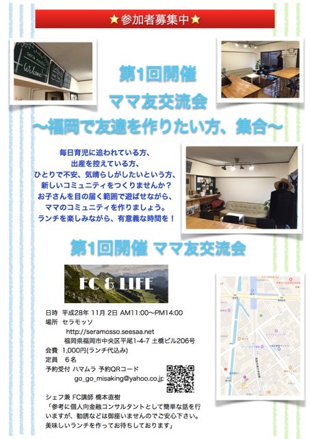 こんにちは♪ 城南区に住んでる8ヶ月男の子のママ、みさきです。 今回はFC兼シェフを巻き込んだ ママ友ランチ交流会を開催いたします。 場所は薬院駅から徒歩圏内のオシャレなカフェスタジオ。 特別な空間を貸しきって新しいママ友のコミュニティをつくりませんか。 遠方から越してきた方、 福岡でお友達をつくりたい方 ママ友づくりの一歩を一緒に踏み出しましょう♪