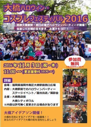 大橋駅前の催しがあるそうなのでご紹介します (投稿者は関係者ではありません) 大人も、子供も、盛り上がれ!! 今年もこのお祭りが大橋西口広場に帰ってくる!! 日時・・・2016年11月3日(祝)11時開始(更衣室は10時30分より受付) 場所・・・西鉄大橋駅西口広場一帯 主催・・・大橋商店街・大橋シティボウル 内容・・・大橋駅前でのハロウィンパーティー 参加費 無料(更衣室使用は500円) 詳細はこちらでご確認ください https://peraichi.com/landing_pages/view/ohashihalloweencosprayfes
