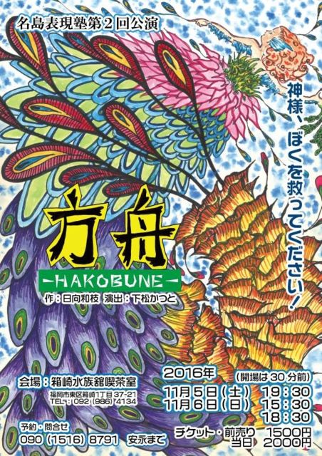 名島表現塾第2回公演 「方舟〜HAKOBUNE〜」 作 日向和枝 演出 下松かつと 日時 11月5日(土) 19:30 11月6日(日) 15:30 18:30 料金 前売1500円 当日2000円 場所 箱崎水族館喫茶室(福岡県福岡市東区箱崎1丁目37−21) バスに乗った男が手にしたのは玉虫色のチケットだった。 光りに透かして見えるのは、蠅・カラス・ぶたが支配する 万華鏡の世界。はたしてこれは現実か、それともあの世の幻か。 男が辿り着いた先は・・・衝撃のラストシー