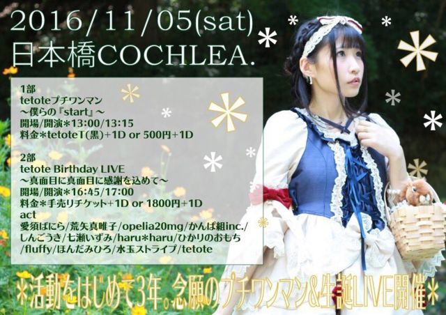 2016/11/5¡ÊÅÚ¡Ë tetote birthday LIVE ¡Á¿¿ÌÌÌܤ˿¿ÌÌÌܤ˴¶¼Õ¤ò¹þ¤á¤Æ¡Á ²ñ¾ì¡§COCHLEA¡¥ ³«¾ì 16:45¡¿³«±é 17:00 ÎÁ¶â ¼êÇä¤ê¥Á¥±¥Ã¥È¡Ê1,500±ß¡Ë or ÅöÆü·ô 1,800±ß¡ÊÊÌÅÓ+ 1D¡Ë DDͽÌó1ÁȤ´¤È¤Ë+1,000±ß act °¦¿Ü¤Ð¤Ë¤é¡¿¹Óë¿¿Í£»Ò¡¿ophelia20mg¡¿¤«¤ó¤ÑÁÈink¡¥¡¿¤·¤ó¤´¤¦¤¡¿¼·À¥¤¤¤Å¤ß¡¿haru✴haru¡¿¤Ò¤«¤ê¤Î¤ª¤â¤Á¡¿fluffy¡¿¤Û¤ó¤À¤ß¤Ò¤í¡¿¿å¶Ì¥¹¥È¥é¥¤¥×¡¿tetote