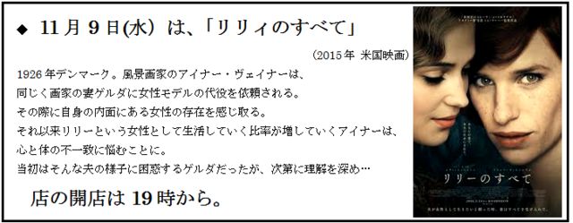 Queer+s MOVIE Night! 11月は「リリィの全て(2015年 英国映画)」 11月9日(水)19:00〜 参加費無料(チャージ料金500円+1Dオーダー) http://queer-s.com/ 毎月第二水曜日は、Queer+s MOVIE Night! 11月の第50回は「リリィの全て(2015年 英国映画)」について語りましょう! ■11月9日(水)19:00〜 ■参加費:無料 (チャージ料金500円と別途ドリンクの注文をお願いします。) ■会場: Queer+s (地図と詳細は下記) http://queer-s.info/ 1926年デンマーク。風景画家のアイナー・ヴェイナーは、 同じく画家の妻ゲルダに女性モデル