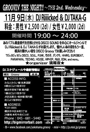 DISCO Groovy 11·î¤ÎÂ裲¿åÍËÆü¤Ï¡ª¥Ð¥Ö¥ë²«¶â»þÂå¤ò×Ç×ʤȤµ¤»¤ëDISCO SOUND¤òÃæ¿´¤Ë¥ª¡¼¥ë¥¸¥ã¥ó¥ë¤ÇDJ Riiiicked¡õDJ TAKA-G¤¬¤ªÆÏ¤±¤·¤Þ¤¹¡£²û¤«¤·¤¤¤¢¤Îº¢¤ò¤â¤¦°ìÅÙ¡¢²£Éͤ層«¤·¤¤Ìë¤òDISCO Groovy¤Ç¤ª³Ú¤·¤ß¤¯¤À¤µ¤¤¡ª ¡Ú¥¸¥ã¥ó¥ë¡Û 70's 80's 90's DISCO¡¢ SOUL¡¢ FUNK¡¢Ãݤλҡ¢ ¥À¥ó¥¯¥é¡¢ HI-NRG¡¢ EUROBEAT¡¢ PARAPARA¡¢ TECHNO¡¢ HOUSE¡¢ HIPHOP¡¢ R&B¡¢ EDM¡¢...andmore ¡ÚDJ's¡Û Riiiicked / TAKA-G ¡Ú³«ºÅ»þ´Ö¡Û 19:00¡Á24:00 ¡ÚÎÁ¶â¡Û ÃËÀ¡§¡ï2,500/2Drinks¡Ü¥Ó¥å¥Ã¥Õ¥§ ½÷À¡§¡ï2,000/2Drinks¡Ü¥Ó¥å¥Ã¥Õ¥§ ¡Ê