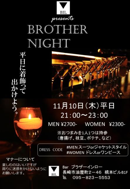 10日木曜日 21:00〜23:00 BARブラザーインロー #MEN. \2700- #WOMEN \2300- ドレスコードあり MEN スーツorジャケットスタイル WOMEN ドレスorワンピース おつまみを1人1品持参してください。