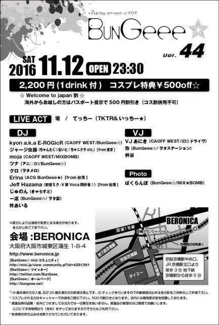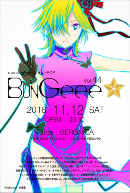 エレガントな雰囲気を纏うエンターテイメントダイニングBERONICA そのBERONICAが一晩中アニソンとJ-POPの熱気に包まれる一夜、BunGeee☆ 今回のLIVE ACTにはアニクラ復活LIVEになる零と、歌い手ユニットてっちーが出演! 初登場DJには京都ヲタメロからクロ、きゃらすとからはじゅのん、アイドルとしても活躍する柊あいるが登場! そして東京からは毎回ジャージを着用する話題のDJジャージ佐藤が大阪にやってくる! さらに台湾から注目株のボカロDJ Jeff Hazamaが日本初登場します! DJ、LIVEACT、VJ、様々なパフォーマーが楽しい時間と