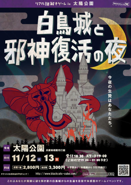 夜の太陽公園を貸しきっての謎解き公演があります。 【STORY】 城のエリアと石のエリアに分かれている太陽公園。 その石のエリアの新しい石像として運び込まれたのは恐るべき邪神像だった!! 白鳥城を乗っ取り、完全復活の準備を進める邪神。 たまたま白鳥城にきていたあなたたちも巻き込まれてしまう! 邪神復活を止める方法を見つけ出し、この地に平穏をもたらすのだ! ■開催日時: 2016/11/12(土)・11/13(日) 受付18:30 スタート19:00 ※解説含めて1公演120分程度 ■開催場所:太陽公園 (姫路) ■定員:各回