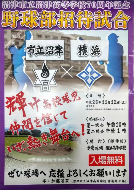 市立沼津×横浜高校 是非球場へ!応援よろしくお願いします! 【日時】 11月12日(土) 雨天中止の場合はホームページ上で告知します。 http://www.genki1.net/numaichikou/ 【プレイボール】 第一試合 AM10時 第二試合 PM1時 【場所】 愛鷹球場 http://www.nicspark.com/ashitaka/ 【招待高】 横浜高校
