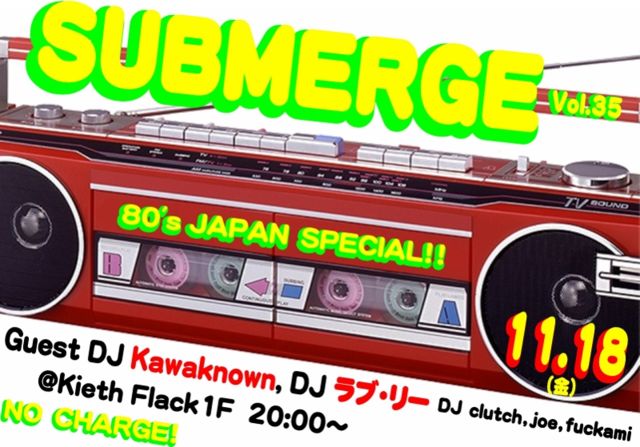 ★submerge★ Vol.35 「80's JAPAN SPECIAL!! 」 2016.11.18(金) 20:00〜25:00 PATIPATI、GB、バンドブーム、ナゴム 、MAJOR FORCE、 YMOとその周辺、さらにアイドル、アニソンまで! 前回動員記録をうち立てたあのゲスト二人を再びお招きして、 80年代の日本を節操なくつなぎます!! Special Guest: DJ Kawaknown https://soundcloud.com/undercurrent_bootleg DJラブ・リー(ぱちゅ〜む/ももいろ黒田藩Z) http://www.youtube.com/results?search_query=%E3%81%B1%E3%81%A1%E3%82%85%EF%BD%9E%E3%82%80 h