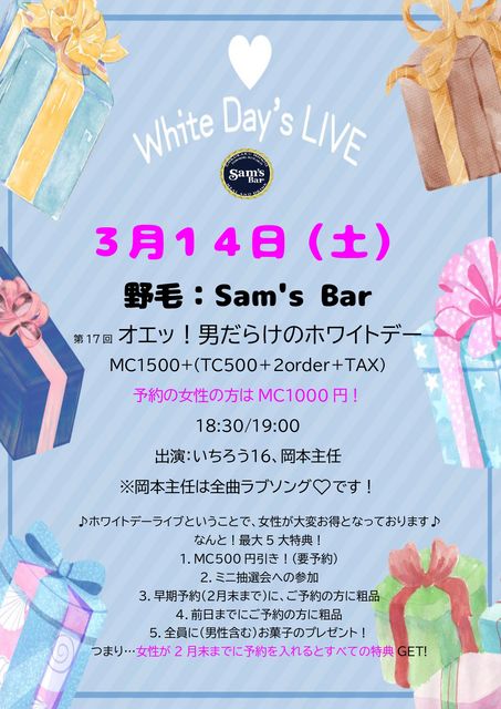 ¡ü³µÍ× £³·î£±£´Æü¡ÊÅÚ¡Ë ÌîÌÓ¡§Sam's Bar http://www7b.biglobe.ne.jp/~samsbar Âè17²ó¡Ö¥ª¥¨¥Ã¡ªÃˤÀ¤é¤±¤Î¥Û¥ï¥¤¥È¥Ç¡¼¡× MC1500+(TC500¡Ü2order¡ÜTAX¡Ë ¢¨Í½Ìó¤Î½÷À­¤ÎÊý¤ÏMC1000±ß¡ª 18:30/19:00 ½Ð±é¡§¤¤¤Á¤í¤¦£±£¶¡¢²¬ËܼçǤ ¡ü¥¿¥¤¥à¥¹¥±¥¸¥å¡¼¥ë 19:00¡¡°§»¢ 19:05¡¡¤¤¤Á¤í¤¦16 19:50¡¡µÙ·Æ 20:00¡¡ÃêÁª²ñ 20:15¡¡²¬ËܼçǤ 21:00¡¡Ž±ŽÝŽºŽ°ŽÙ޾ޝ޼ޮŽÝ 21:15¡¡½ª±é ¡¡¡¡ ¡üÆÃŵ ¥Û¥ï¥¤¥È¥Ç¡¼¥é¥¤¥Ö¤È¤¤¤¦¤³¤È¤Ç¡¢½÷À­¤¬ÂçÊѤªÆÀ¤È¤Ê¤Ã¤Æ¤ª¤ê¤Þ¤¹¢ö £±¡¥MC500±ß°ú¤­¡ª¡ÊÍ×ͽÌó¡Ë £²¡¥¥ß¥ËÃêÁª²ñ¤Ø¤Î»²²Ã £³¡¥2·îËö¤Þ