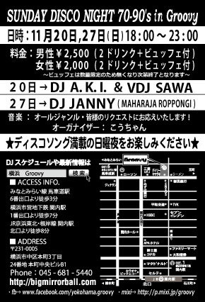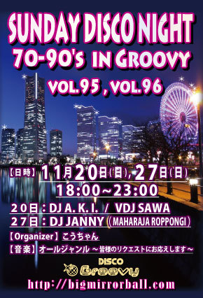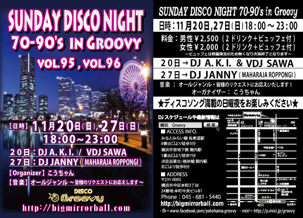 11月も第3&第4の日曜日に開催となります【SUNDAY DISCO NIGHT】日曜日にしかお出かけできない方々など、休日でもDISCOなNIGHTを存分にお楽しみいただけます(^_-)-☆♬ 【オーガナイザー】こうちゃん 【DJ A.K.I. &VDJ SAWA】 【音楽】オールジャンル (SOUL、竹の子、EURO、HI-NRG、R&B、etc... 皆様のリクエストにお応えします!) 【開催時間】18:00〜23:00 【料金】 男性:¥2,500/2Drinks+ビュッフェ付 女性:¥2,000/2Drinks+ビュッフェ付 (ビュッフェは18時よりご用意しますが数量限定につき無くなり次第終了と