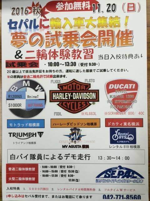 『セパル輸入車大試乗会&体験教習(^^♪』 ●開催 平成28年11月20日(日) ●時間 午前11時00分〜午後2時00分ころまで ●場所 セパルライディングスクール橋本 (神奈川県相模原市緑区西橋本3丁目11番24号) ●参加費用 無料 ・・・以下セパルライディングスクールのFBの文章をコピーさせていただきました。 試乗会&体験教習、ご希望の方!大・大・大募集♪ sepal@haragroup.co.jp に、メール送信してくださいv 「FBを見た!」&お名前・ご住所・ご連絡先をお書きください。 今後