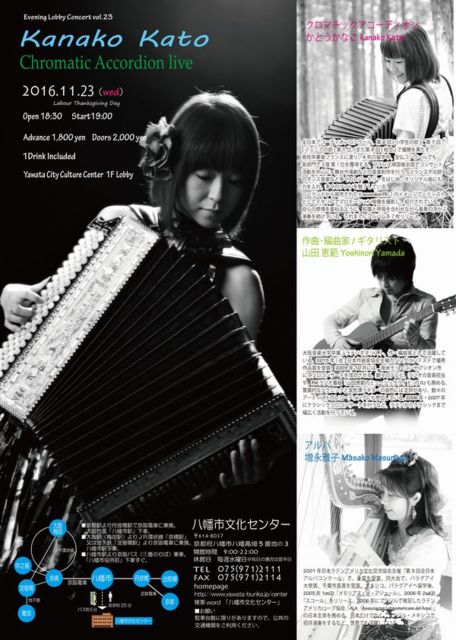 ¥¤¥Ö¥Ë¥ó¥°¥í¥Ó¡¼¥³¥ó¥µ¡¼¥ÈVol.23 ¥Õ¥é¥ó¥¹¤Î¶Ê¡¢¥ª¥ê¥¸¥Ê¥ë¤Ï¤â¤Á¤í¤ó¡¢ÆîÊÆ¤Î¤¢¤Î¶Ê¤â¢ö ²Ú¤ä¤«¤Ê¥³¥ó¥µ¡¼¥È¤Ë¤Ê¤ë¤³¤È´Ö°ã¤¤¤Ê¤·¢ö ²ñ ¾ì ȬȨ»Ôʸ²½¥»¥ó¥¿¡¼ http://www.yawata-bunka.jp/center/ µþÅÔÉÜȬȨ»ÔȬȨ¹âȪ5ÈÖÃÏ3 TEL:075-971-2111 »þ ´Ö ³«¾ì 18:30 / ³«±é 19:00 ½Ð ±é ¤«¤È¤¦¤«¤Ê¤³ (Acc) / Áý±Ê²í»Ò (Arpa) / »³ÅÄ·ÃÈÏ (Gt) ¥Á¥±¥Ã¥È ÎÁ¶âÁ°Çä1,800±ß/ÅöÆü2,000±ß(1¥É¥ê¥ó¥¯ÉÕ) ¡Ú¤ªÌä¹ç¤»¡Û Ȩ»Ôʸ²½¥»¥ó¥¿¡¼ ÅÅÏÃͽÌó¤Î¤ß TEL:079-971-2111