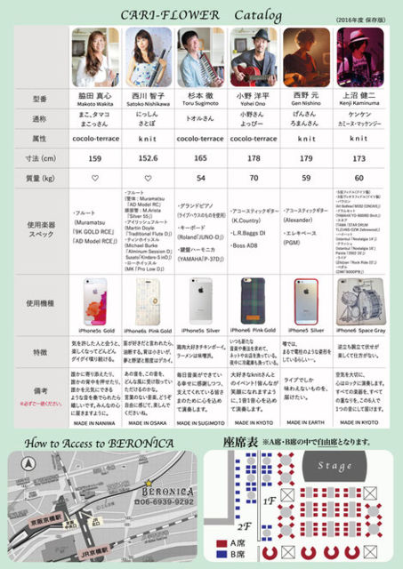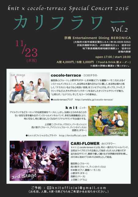 あの大人気スペシャル企画、カリフラワーが今年も開催決定!!! cocolo-terraceとknitのコラボバンド、 CARI-FLOWERはこのイベントでしかお楽しみいただけません。どうぞお見逃しなく! [場所] 京橋 BERONICA http://beronica.jp/access.html (大阪府大阪市城東区蒲生1-8-4) (京阪京橋駅中央口、JR京橋駅北口より徒歩3分) (地下鉄長堀鶴見緑地線京橋駅から徒歩5分) ※会場内禁煙 [時間] open 17:00 / start 18:00 [料金] A席 4,000円 / B席 3,000円(Food&Drink要オーダー) ※詳しくは下記座席表をご覧