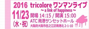 tricoloreワンマンライブ 2016年 11月 23日 (水曜日) カレンダー tricolore ライブスケジュール 説明 〜 a link of happiness〜 [時間] 開場14:15 開演15:00 [チケット] 前売 3,000円 当日3,500円 ☆先行予約☆ 8/11(木 祝)お昼12:00から 8/14(日)23:59まで 『tickets@tricolore-net.jp』まで ▼記入例▼ [件名] 11/23ワンマン [本文]・お名前・ご予約枚数・ご連絡先 を送信ください。 ※tickets@tricolore-net.jpよりメールが受信できますよう、事前にドメインの設定をお願いいたします。 ※入場は