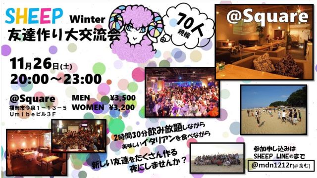 友達作りサークルSHEEP恒例の 交流イベントです٩( 'ω' )و お一人での参加も、初参加も大歓迎です♪ 毎回半数程度の方が初参加なので すぐ緊張もほぐれ友達ができますよ(o^^o)★ 会場のSquare╰(*´︶`*)╯ オシャレなお店で、今泉なので立地も抜群★ 美味しいイタリアンとお酒を楽しみながら 友達をたくさん作る夜にしましょう\( ˆoˆ )/ ●詳細● ★SHEEP友達作り大交流会★ ○日程○ 11/26(土)20:00〜23:00 【20:00〜受付開始】 ○会場○ Square 福岡市今泉1-13-5 Umibeビル3F
