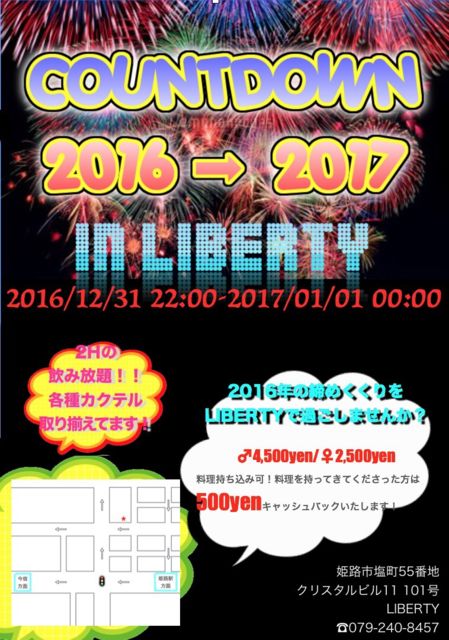 カウントダウンイベントを姫路で行います☆ 《開催日時》 12月31日(土)〜1月1日(日) 22:00〜0:00です! 21:45 受付開始! 22時からの2時間飲み放題です★ 今年ももぉ終わりですね(ToT) 1年どうでしたかー?? 良かった方も、悪かった方も みんなで今年最後を盛り上げましょう\(^o^)/ 《参加方法》 以下の項目を直接メールで ご連絡お願い致します。 ・お名前 ・ご年齢 ・性別 ・参加人数 またキャンセルの際も ご一報くださいませ。 ご連絡いただけなかった 参加者様には次回の参加を お断りさせていただく 場合がございま