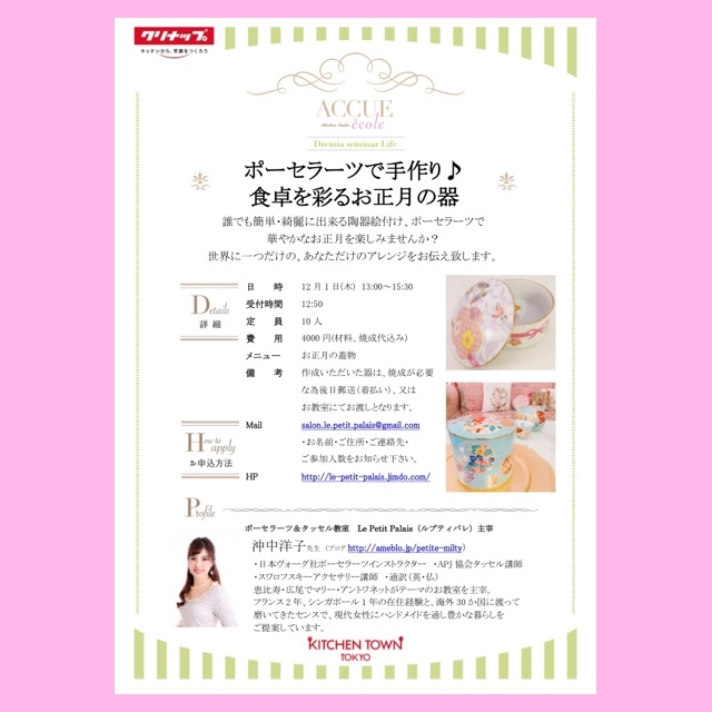 美Premium掲載!東京恵比寿・広尾のお稽古サロンLe Petit Palaisルプティパレより♪ クリナップ東京様とコラボのポーセラーツお正月スペシャルレッスンのお知らせです。 お写真の可愛い”ミニのお重”をお作りいただく1dayレッスン参加者の募集です♡ デザインは、お写真以外にお好きなものを組み合わせてお作りいただけます♪ 特殊な絵付け用シールを使うので、誰でも簡単! しかも、仕上がりも綺麗! サロン主宰自ら、マル秘テクニックもお伝え致します。 こちらのレッスンご受講いただきました方は、サロンへの入会金が