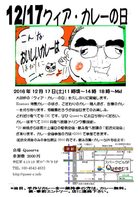 Â繥ɾ¤Î¡Ö¥¯¥£¥¢¡¦¥«¥ì¡¼¤ÎÆü¡×¤òµ×¤·¤Ö¤ê¤Ë³«ºÅ¤·¤Þ¤¹¡£ EsamanÆÃÀ½¥«¥ì¡¼¤Î¤Û¤«¡¢¤³¤À¤ï¤ê¤Î¥«¥ì¡¼¿¦¿Í㤬¡¢¼«Ëý¤Î¥«¥ì¡¼¤ò»ý¤Á´ó¤ê¤Þ¤¹¡£²¿¼ïÎऽ¤í¤¦¤«¤ÏÅöÆü¤Þ¤Ç¤Î¤ª³Ú¤·¤ß¡£ ¤É¤ì¤À¤±¿©¤Ù¤Æ¤âOK¤Ç¤¹¡£ ¤¼¤ÒQueer+s¤Ë¤ªÎ©¤Á´ó¤ê¤¯¤À¤µ¤¤¡£ 2016ǯ12·î17Æü 11»þº¢-14»þ 18»þ-Mid ²ñ¾ì Queer+s »²²ÃÈñ 2000±ß *¤³¤ÎÆü¡¢20»þº¢¤«¤é¡¢Âè»°¿åÍËÆü¹±Îã¤Î°û¤ß¿©¤ÙÊüÂê´ë²è ¡ÖÆú¿§¸òή²ñ¡×¤¬¤´¤¶¤¤¤Þ¤¹¡£ º£²ó¤Î»²²ÃÈñ¤Ï3500±ß¡£¥Õ¥ê¡¼¥É¥ê¥ó¥¯¤Î¸«ÊüÂê¤Î¤Û¤«¡¢¥«¥ì¡¼°Ê³°¤ÎÎÁÍý¤â¤Ç¤Þ¤¹¡£ ¥«¥ì¡¼¤ÎÆü¤«¤é¤Î·Ñ³»²²Ã¤ÎÊý¤Ï¡¢+2000¤Ç¤´