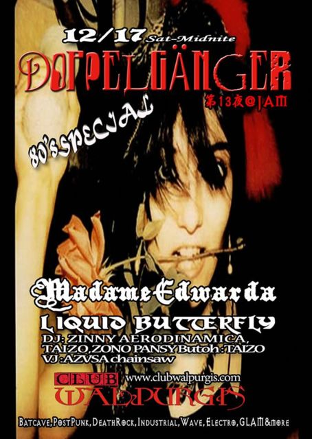 12/17(sat-midnight) OPEN/START : 0:30am〜Dawn Advanced (前売/予約)2800+Drink /Door(当日)3500+Drink at 新宿JAM : 東京都新宿区歌舞伎町2-3-23 セントラルビル1F&B1 TEL:03-3232-8168 (15:00〜24:00) 次回CLUB WALPURGISは "80S SPECIAL"。 12/17土曜深夜〜12/18日早朝まで 新宿JAMにて開催。 LIVEはMADAME EDWARDAをはじめ、関西よりLIQUID BUTTERFLYを迎え、2016年ラストを飾るセッションも予定。 DJ ZINNY AERODINAMICA(ZIN)/TAIZO ZONO PANSYの選曲にもご期待ください。 今回は80sをテーマに、80年代のワルプルギスで かかって