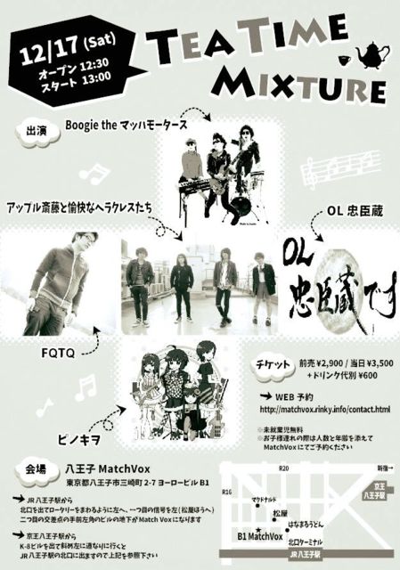 11月30日(水) 東京都 八王子 Match Vox http://matchvox.rinky.info/ 「Tea time mixture」 出演:Boogie the マッハモータース/アップル斎藤と愉快なヘラクレスたち/FQTQ/OL忠臣蔵/ピノキヲ open12:30 start13:00 前売り2900円 当日3400円 共に+1DRINK