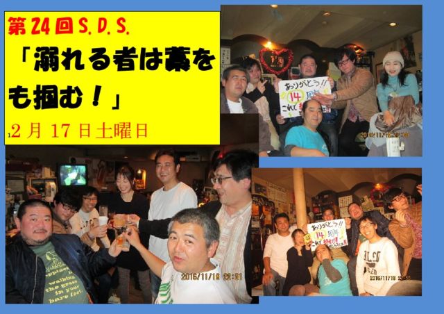 第24回S.D.S.溺れる者は藁をも掴む!12月17日土曜日 毎度お騒がせしております(笑)。 ハッキリと明確なまでにスカド救済イベントです(笑)。 来年のスカド存続に対しての御意見・御要望をお聴きし、 スカド経営戦略をネタにしつつの呑み会であります(笑)。 まぁ、そんな事ぁ単なる理由付けで、常連さんが集まって 呑もう!というお気楽な企画であります(笑)。 通常営業であります♪ 当日の出し物・Live!寸劇!研究発表!人形劇!等々、 出演御希望の方は、御連絡下さいませ♪ よろしくお願いいたします!!!