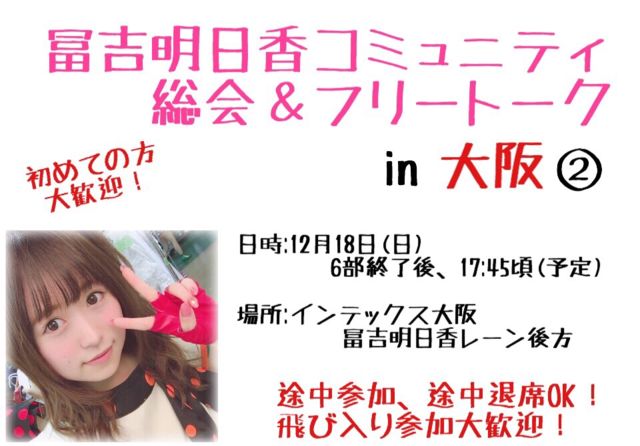 12·î18Æü¤Ë¥¤¥ó¥Æ¥Ã¥¯¥¹Âçºå¤Ç³«ºÅ¤µ¤ì¤ëAKB48¡Ö¥Ï¥¤¥Æ¥ó¥·¥ç¥ó¡×°®¼ê²ñ¤Ë¤ÆÉÚµÈÁí²ñ&¥Õ¥ê¡¼¥È¡¼¥¯¤ò¹Ô¤¤¤Þ¤¹¡£ 6Éô¼õÉÕ½ªÎ»¸å¤Î17»þ45ʬº¢¤è¤êÉÚµÈÌÀÆü¹á¥ì¡¼¥ó¸åÊý¤Ç³«»ÏͽÄê¤Ç¤¹¡£ (¾ì½ê¤¬°Üư¤¹¤ë¾ì¹ç¤â¤¢¤ê¤Þ¤¹) Áí²ñ¤ÎµÄÂê¤È¤¤¤¿¤·¤Þ¤·¤Æ ¡¦°§»¢¡¢¼«¸Ê¾Ò²ð ¡¦¹ÈÇò²Î¹çÀïÁªÈ´¤Ë¤Ä¤¤¤Æ ¡¦Ç¯²ì¾õ´ë²è¤Ë¤Ä¤¤¤Æ ¡¦9th¥·¥ó¥°¥ëÁªÈ´Æþ¤ê¤ª½Ë¤¤´ë²è¤Ä¤¤¤Æ ¡¦¥³¥ß¥å¥Ë¥Æ¥£ËºÇ¯²ñ¡¢¿·Ç¯²ñ¤Î¤ªÃΤ餻 ¡¦¤½¤Î¾ϢÍíÄ´À°»ö¹à¡¢¼ÁÌä¼õÉÕ °Ê¾å¤ÎÆâÍÆ¤òÏ¢Íí¸å¡¢Éڵȿ䤷¤Î³§¤µ¤ó¤Ç¼«Í³¤Ë¥È¡¼¥¯¤ò¤¹¤ëή¤ì¤Ë¤Ê¤ê¤Þ¤¹¡£ ½é¤á¤Æ¤ÎÊýÂç´¿·Þ