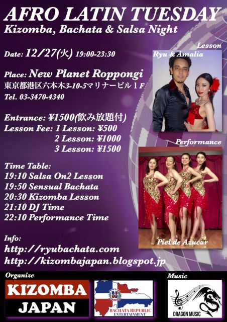 ¡úAfro Latin Tuesday@Ï»ËÜÌÚNew Planet¡ú Kizomba, Bachata & Salsa¤ò³Ú¤·¤á¤ë°û¤ßÊüÂꥤ¥Ù¥ó¥È¤Ç¤¹¡£ ¥ì¥Ã¥¹¥ó¤ÏKizomba, Bachata & Salsa¤Î3¥³¥Þ¤¢¤ê¤Þ¤¹¡£DJ¥¿¥¤¥à¤Î¶Ê¤Î¥ê¥¯¥¨¥¹¥ÈÂç´¿·Þ¤Ç¤¹¡ª ½é¿´¼Ô¤ÎÊý¤Ï¥¢¥·¥¹¥¿¥ó¥È¤Ë¤è¤ë¥µ¥Ý¡¼¥È¤¬¤¢¤ê¤Þ¤¹¡£ º£²ó¤Î¥Ñ¥Õ¥©¡¼¥Þ¥ó¥¹¤ÏRyu¥×¥í¥Ç¥å¡¼¥¹¥ì¥Ç¥¤¡¼¥¹¥Ð¥Á¥ã¡¼¥¿¥Ñ¥Õ¥©¡¼¥Þ¥ó¥¹¥Á¡¼¥à¡ÖPiel de Azucar¡×¤Ç¤¹¡£Ï»ËÜÌÚNew Planet¤Ç¤ªÂÔ¤Á¤·¤Æ¤¤¤Þ¤¹¡£ ¢¡Æü»þ¡§12·î27Æü¡Ê²Ð¡Ë19:00-23:30 ¢¡¾ì½ê¡§New Planet Roppongi ÅìµþÅÔ¹Á¶èÏ»ËÜÌÚ3-10-5¡¡¥Þ¥ê¥Ê¡¼¥Ó¥ë£±F Tel. 03-3470-4