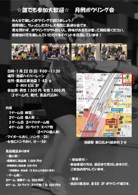 みんなで楽しくボウリングで遊びましょう (^O^)/ 朝、早朝にちょっとしたストレス発散に最適な会です。 男女問わず、ボウリングがやりたい人、興味がある方は奮って御応募ください。 初参加の方も楽しんでいただけるイベントを目指しています。♪ 日時 1月22日(日) 9:00〜11:30 場所 ハイパーレーン 住所 豊島区東池袋1-43-6 D-BOXビル3F 集合 8:55 現地ボウリング場 3F受付 アクセス 池袋駅 東北口から徒歩3分 募集期限 前日まで受付 参加費 男性1,500円 女性1,000円 (3ゲーム代、靴代、景品代込み) 1ゲーム