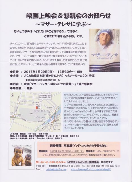 »ä¤¬²ñ°÷¤Ç¤¢¤ë¡¡NPO¥ì¥¤¥ó¥Ü¡¼¹ñºÝ¶¨²ñ ¥¤¥ó¥É¤ÎKOLKATA¡Ê¥³¥ë¥«¥¿¡Ë¤Ç»Ò¶¡¤Î»Ù±ç¤ò¤·¤Æ¤¤¤ëNPO¤Ç¤¹¡£ º£²ó £²£°£±£·Ç¯£±·î£±£¸Æü¡Á£³£±Æü »Ô¥öë¤ÎJICAÃϵå¤Ò¤í¤Ð¤Ë¤Æ¼Ì¿¿Å¸¤ò³«ºÅÃæ ¡Ö¥¤¥ó¥É¡¦¥³¥ë¥«¥¿¤Î»Ò¶¡¤¿¤Á¡× ¤½¤ì¤Ëȼ¤Ã¤Æ £²£¹Æü¡ÊÆü¡Ë¡¡±Ç²è¾å±Ç²ñ¡õº©¿Æ²ñ ¡Ö¥Þ¥¶¡¼¡¦¥Æ¥ì¥µ¡ÁÊì¤Ê¤ë¤Ò¤È¤Î¸ÀÍաפΠ¥Þ¥¶¡¼¤Î¥á¥Ã¥»¡¼¥¸¤Ë¿¨¤ì¤Ê¤¬¤é »²²Ã¼ÔƱ»Î¤ÇÏä·¹ç¤Ã¤Æ¤ß¤Þ¤·¤ç¤¦ ¥Þ¥¶¡¼¡¦¥Æ¥ì¥µÂç¹¥¤¤ÊÊý ¥¤¥ó¥É¤Ë¶½Ì£¤Î¤¢¤ëÊý ¥Ü¥é¥ó¥Æ¥£¥¢¤Ë¶½Ì£¤Î¤¢¤ëÊý »Ù±ç¤·¤Æ¤¤¤ë³èư¤Ë¶½Ì£¤Î¤¢¤ëÊý »²²Ã¤ò¤ªÂÔ¤Á¤·¤Æ¤ª¤ê¤Þ¤¹