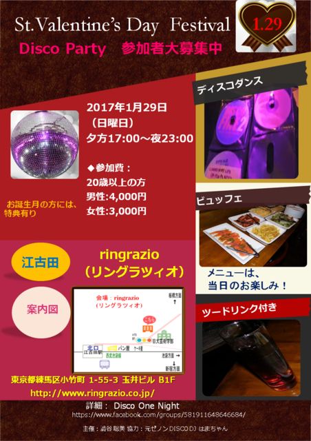 ¡ú¡ÖDisco One Night¡×¤«¤é DISCO in ¹¾¸ÅÅÄ ¥Ð¥ì¥ó¥¿¥¤¥ó¥Õ¥§¥¹¥Æ¥£¥Ð¥ë St. Valentine's Day Festival¤Î¤ªÃΤ餻¤Ç¡Á¤¹¡£ DISCO¥À¥ó¥¹¤òÍÙ¤ì¤ë¿Í¤â¤½¤¦¤Ç¤Ê¤¤¿Í¤â ¤ªÍ§Ã£¤òͶ¤Ã¤Æµ¤·Ú¤ËÍè¤Æ¤Í¡£ ¤´É×ÉØ¤Ç¤â¥«¥Ã¥×¥ë¤Ç¤â¤ª°ì¿Í¤ÎÊý¤Ç¤âÂç´¿·Þ 80'SÍγÚDISCO¶Ê¤ò³Ý¤±¤Á¤ã¤¤¤Þ¤¹¡£ ¢¡2017ǯ1·î29Æü¡ÊÆüÍËÆü¡Ë¤Ë ÅìµþÅÔÎýÇ϶蹾¸ÅÅĤÎringrazio¡Ê¥ê¥ó¥°¥é¥Ä¥£¥ª¡Ë¤Ç ¥Ð¥ì¥ó¥¿¥¤¥ó¥Ç¡¼ DISCO¥Ñ¡¼¥Æ¥£¡¼¤ò³«ºÅ¤·¤Þ¤¹¤è¡£ ¥Ä¡¼¥É¥ê¥ó¥¯ÉÕ¤¤Ç¥Ó¥å¥Ã¥Õ¥§¤ò¿©¤Ù¤ì¤ë¤è¡£¢ö ͼÊý17:00¡ÁÌë23:00¤Þ¤Ç¡ÊÅÓÃæÆþ¾ìOK¡Ë¤Ç¤¹¤Î¤Ç