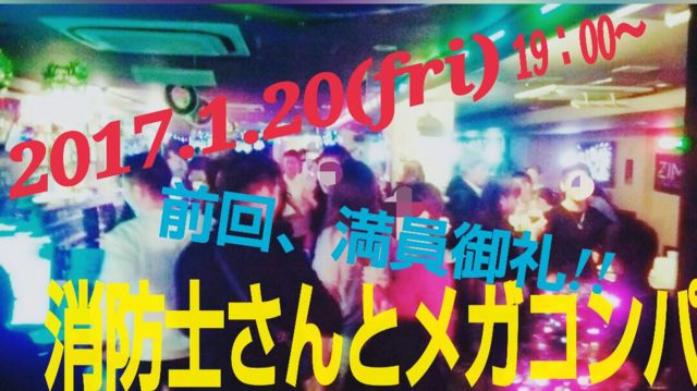 【消防士さんと約70名様〜メガコンパ★part2】 満員御礼イベントの第2弾です!! 前回は消防士さん65名&女性65名、総勢130名様のご参加ありがとうございました!! そして!!とも★つく公式LINEアカウントのIが変更になりました! 新とも★つく公式LINEアカウント【ラインID 42337302】 旧アカウントにメッセージを頂いてる方は、大変申し訳ございませんが、新アカウントまで、再度ご連絡ください★ (12月30日以降に頂いたメッセージは、原因不明のシステムダウンにより、一切確認できないままです。) ★2017年1月20日(金) ★19時〜(途中参加