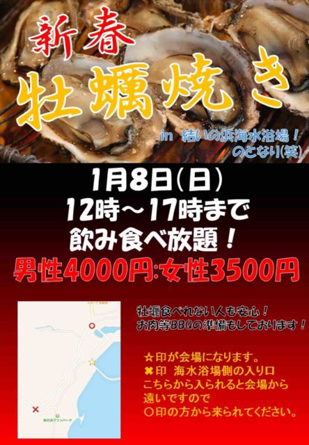 8日(日)に牡蠣焼きイベントやります〜(^^) 場所:飯盛 結いの浜海水浴場近く 詳しくはお知らせの地図を参考にしてください 日時:8日(日)12:00〜17:00 5時間食べ飲み放題! 会費:男性 4000円 女性 3500円 食材の関係で参加人数を知りたいので参加される方は ココに書き込むかボクにメッセージください(^^) 牡蠣苦手な方にもお肉を準備してます♪ 年齢層は今の所20〜30代で20代が多いです �飲酒運転は禁止します! よろしくお願いします(^^)