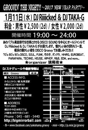 DISCO Groovy 1月の第2水曜日は!バブル黄金時代を彷彿とさせるDISCO SOUNDを中心にオールジャンルでDJ Riiiicked&DJ TAKA-Gがお届けします。懐かしいあの頃をもう一度、横浜の輝かしい夜をDISCO Groovyでお楽しみください! 【ジャンル】 70's 80's 90's DISCO、 SOUL、 FUNK、竹の子、 ダンクラ、 HI-NRG、 EUROBEAT、 PARAPARA、 TECHNO、 HOUSE、 HIPHOP、 R&B、 EDM、...andmore 【DJ's】 Riiiicked / TAKA-G 【開催時間】 19:00〜24:00 【料金】 男性:¥2,500/2Drinks+ビュッフェ 女性:¥2,000/2Drinks+ビュッフェ (ビ