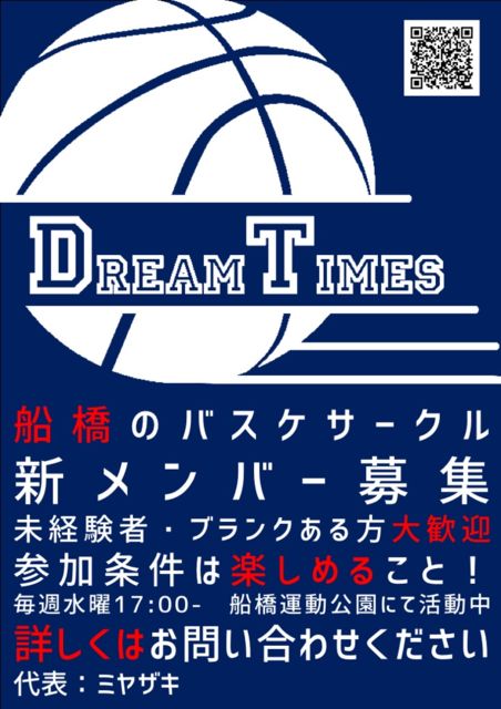 船橋運動公園で活動していますバスケサークルです。 初心者もブランクのある方も大歓迎。 運動不足を解消しましょう。 次回、活動時間のお知らせ! 1/13(金)17:00から19:00 @船橋市運動公園体育館 2016バスケ始め 次回は集まり次第17:30頃よりゲームを開始したいと考えております。 ご都合つく方はぜひお越しください。 持ち物はシューズのみ 詳しい情報はツイッターにて配信しております。 https://twitter.com/DREAM_TIMES_ よろしくお願いいたします