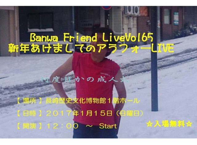 Banwa Friend Live vol.65 in れきぶん 新年あけましてのアラフォーLIVE ☆懐かしの曲で Happy New Year☆ 〜何度目かの成人式〜 【 場所 】長崎歴史文化博物館 1階ホール 【 日時 】2017年1月15日(日曜日・星人の日) 【開演時間】12:00 〜 Start もちろん入場無料です(^^)/ 誰でも出れます!! ライブ持ち時間20〜30分です!!