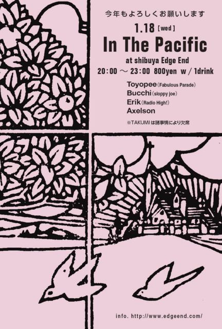 ¡ÚIn The Pacific 118¡Û 2017/1/18¡ÊWed¡Ë ¡÷½ÂëEdge End¡¡http://www.edgeend.com/ 20¡§00¡Á23¡§00¡¡800yen w/1d DJs¡§ ¡¡toyopee¡ÊRainbow Chaser /A Love Song¡Ë ¡¡takumi¡ÊErica¡Ë ¢«½ô»ö¾ð¤Ë¤è¤ê·çÀÊ ¡¡Bucchi¡Êsloppy joe¡Ë ¡¡ERIK¡ÊRadio High!¡Ë Axelson º£Ç¯ºÇ½é¤Î¥¤¥ó¥Ñ¥·¤Ç¤¹¡£ ¿·Ç¯¤Ý¤¯¡¢³Ú¤·¤¯Æø¤ä¤«¤Ê´¶¤¸¤Ç¤ªÁ÷¤ê¤·¤¿¤¤¤È»×¤¤¤Þ¤¹¡£ ¤ªµ¤·Ú¤ËÍ·¤Ó¤ËÍè¤Æ¤¯¤À¤µ¤¤¤Í¡£´¥ÇÕ¤·¤Þ¤·¤ç¤¦¡ª