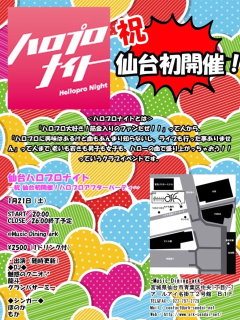 “仙台ハロプロナイト” 〜祝・仙台初開催&ハロコンアフターパーティー!〜 日時:2017年1月21日(土)20:00〜26:00! 会場:Music Dining ark 022-797-2729 住所:宮城県仙台市青葉区中央1-7-2 アールアイ名掛丁2号館B1F Web / http://www.ark-sendai.net/ 料金:当日2,500円(1ドリンク付) DJ:龍斗/グランバザーミー/渡辺めたる/クニオ/etc Show Time:ほのか/もか/etc 映像制作:KASSY?/青迷彩/メルティーローズ/etc ※Show Timeあり ☆出演者は予告なく追加・変更する場合があります。 【ハロプロナイトとは…?