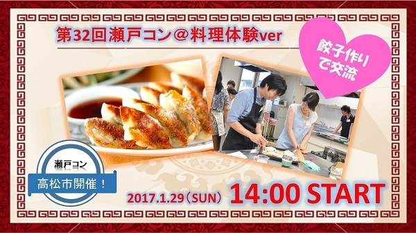 ▼第32回目のコンセプトについて ・1人参加大歓迎!『趣味コン形式』で開催! (※お友達同士で参加は3名様までなら可能な限り対応致します) ・男女共同で料理を行いながら進行すますので自然と仲良くなれます! (※緊張せずに自然と会話が弾みます!) ・料理初心者の男女でも当日はマニュアルをお渡ししますので、誰でも出来ます! ☆今回の料理コンは『餃子作り』に挑戦して頂きます! ■当日のタイムスケジュール 13:30〜13:50 受付店舗での受付 (※時間に余裕をもってお越し下さい) ↓ 14:00〜 瀬戸
