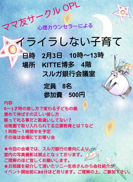 ¥Þ¥Þͧ¥µ¡¼¥¯¥ëOPL¤Î2·î3Æü¤Ë³«ºÅ¤¹¤ë¥¤¥Ù¥ó¥È¤Ç¤¹¡£»²²Ã½ÐÍè¤ë»þ¤Ë»²²Ã¤¹¤ë¼«Í³»²²Ã·¿¤Î¥µ¡¼¥¯¥ë¤Ç¡¢¿§¤ó¤Ê´ë¶È¤Î°ì¼¼¤ò¼Ú¤ê¤Æ³èưͽÄê¤Ç¤¹¡£ º£²ó¤Ï¥¹¥ë¥¬¶ä¹Ô¤Ë¤Æ¡¢¿´Íý¥«¥¦¥ó¥»¥é¡¼¤Ë¤è¤ë¥¤¥é¥¤¥é¤·¤Ê¤¤»Ò°é¤Æ¤ò³Ø¤Ó¤Þ¤¹¡£ ¤ª»Ò¤µ¤ÞÏ¢¤ìOK¤Ç¤¹¤¬¡¢¼øÆý¡õ¤ª¤à¤ÄÂØ¤¨¥ë¡¼¥à¤¬¤´¤¶¤¤¤Þ¤»¤ó¡£°û¿©¤â¤ª»Ò¤µ¤ÞOK¤Ç¤¹¤¬¡¢Âç¿Í¤Ï°û¤ßʪ¤Î¤ß¤Ë¤Ê¤ê¤Þ¤¹¤Î¤Ç¤´Î»¾µ²¼¤µ¤¤¡£ Äê°÷8ÁȤȤ·¤Æ¤¤¤Þ¤¹¤¬¡¢»Ä¤ê4ÁȤȤʤê¤Þ¤¹¤Î¤Ç¤´»²²ÃËô¤Ï¤´¼ÁÌ䤴¤¶¤¤¤Þ¤·¤¿¤é¤ªÃΤ餻²¼¤µ¤¤¡£