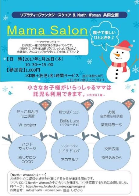ソプラティコファンタジースクエアhttp://fantasy.sopratico.com/は、 サッポロファクトリーにある、託児スペースなんですね。 そちらで、north-woman http://www.north-woman.com/の共同企画として、 「Mama Salon」を行うことになりました 私は、シンクロニシティカード リーディングで参加します シンクロニシティカードとは? シンクロニシティとは、内側の意識で創る事が、 魂から見ると外側である現実とのマッチングが起こる事です。 もちろん、わけもなく、同じ数字を何度も見る!とか、 同じワードを