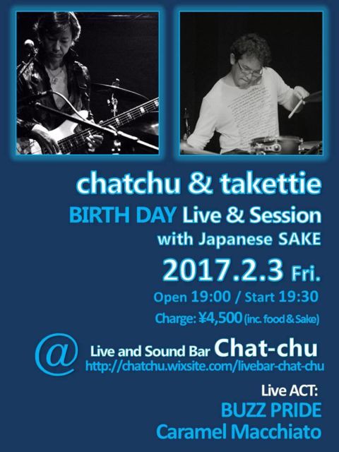 ³§Íͤ˰¦¤µ¤ì¤Æ¤¤¤ë¡¡¤¿¤±¤Á¡¼¡õ¤Á¤ã¤Ã¤Á¤å ¤Ê¤ó¤ÈƱ¤¸ÃÂÀ¸Æü¤Î¤ªÆó¿Í¤Î£Â£Ä¥¤¥Ù¥ó¥È¤ò¹Ô¤¤¤Þ¤¹¡£ ÆâÍÆ¤ÏLive¤È¥»¥Ã¥·¥ç¥ó¤ÈޤÆüËܼò¤Ç¤¹£÷ ÆüÄø¡§2017ǯ2·î3Æü¡Ê¶â¡Ë19:00OPEN¡¡19:30START ¾ì½ê¡§Live & Sound Bar Chat-chu ¡¡ http://chatchu.wix.com/livebar-chat-chu ²ñÈñ¡§4500±ß¡¡¡Ê¥ß¥å¡¼¥¸¥Ã¥¯¥Á¥ã¡¼¥¸¡¦ÎÁÍý¡¦ÆüËܼò¡¦Ï¤餮¿å¡Ë ¡¡ ¢¨ÆüËܼò¤Ï°ì¿Í£³¹ç°Ê¾å¤Î¤ª¼ò¤òÍѰդ·¤Þ¤¹¡£¤â¤Á¤í¤óÆüËܼò»ý¤Á¹þ¤ß¤â£Ï£Ë¤Ç¤¹¡£ ¡¡ ¢¨ÎÁÍý¤Ïޤ¤ª¤Ç¤ó¤òÃæ¿´¤Ë¡¢¥¢¥ó¥Á¥ç¥Ó¤¤å¤¦¤ê¤Ê¤ÉChat-chu ÄêÈÖ¤«¤éÆüËܼò¤Ë¤¢¤¦ÎÁÍý¤¬½Ð¤Þ¤¹¡£