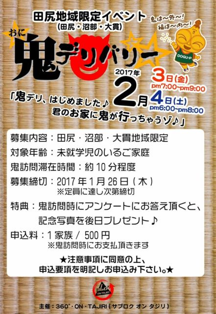 👹申込要項 ・保護者様氏名 ・お子様氏名 ・住所 ・連絡先 ・メールアドレス(写真データ受け取り用として) ・鬼からお子様に伝えてもらいたいこと(食べ物の好き嫌いをなくしてもらいたい、お母さんの言うことをちゃんと聞いてほしい…など) ・鬼の種類(怖い鬼、楽しい鬼) ・鬼の登場の仕方(屋外、室内) 👹注意事項 ・お申し込みは先着順となります。 ・鬼はイベント開催時間内で回りますので、訪問時間の指定はできかねます。前々日の2月1日(水)までに訪問時間をお伝えする予定です。 ・豆まきに使用する豆は各ご家庭でご用