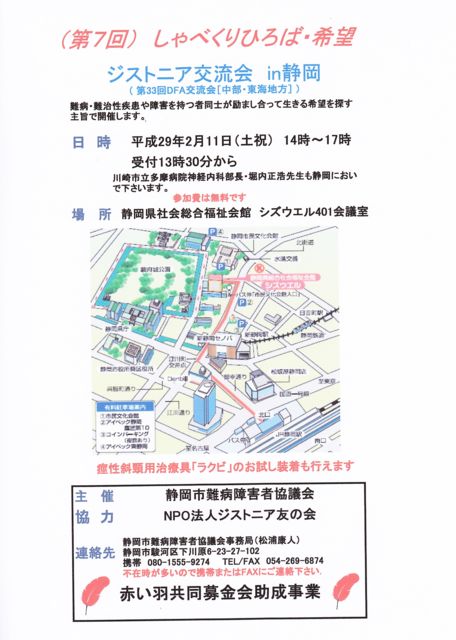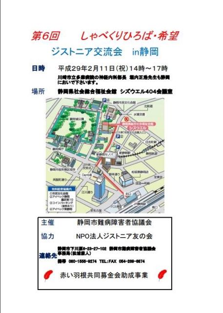 ÀŲ¬»ÔÆñɾ㳲¼Ô¶¨µÄ²ñ¼çºÅ¤Î¡ÖÂè6²ó¤·¤ã¤Ù¤¯¤ê¹¾ì¡¦´õ˾¡×¤Ï¥¸¥¹¥È¥Ë¥¢¸òή²ñ¤Ç¤¹¡£ ËÙÆâÀµ¹ÀÍý»öĹ¤Ï¤¸¤á¡¢¥¸¥¹¥È¥Ë¥¢Í§¤Î²ñÍý»ö¤â»²²Ã¤¹¤ëͽÄê¤Ç¤¹¡£áÛÀ¼Ððô¼£ÎŶñ¡Ö¥é¥¯¥Ó¡×¤Î¥á¡¼¥«¡¼Ã´Åö¼Ô¤â¾·¤¡¢»îÃå¤â¤Ç¤¤Þ¤¹¡£ ¤ª¶á¤¯¤ÎÊý¤Ï¤¼¤Ò¤´»²²Ã¤¯¤À¤µ¤¤¡£ Æü»þ¡§2·î11Æü¡Ê½Ë¡Ë14:00¡Á17:00 ²ñ¾ì¡§ÀŲ¬¸©¼Ò²ñÁí¹çÊ¡»ã²ñ´Û¥·¥º¥¦¥¨¥ë404²ñµÄ¼¼ »²²ÃÎÁ¡§ÌµÎÁ ¿½¤·¹þ¤ß¡§dystonia2005@yahoo.co.jp ¢¨²ñ¾ìÄê°÷¤Ë¸Â¤ê¤¬¤¢¤ê¤Þ¤¹¡£Äê°÷¤Ë㤷¤¿¾ì¹ç¤Ï»²²Ã¼õÉÕ¤òÄù¤áÀÚ¤ê¤Þ¤¹¤Î¤Ç¤´Î»¾µ¤¯¤À¤µ¤¤¡£ ¼ç ºÅ ÀŲ¬»ÔÆñɾ㳲¼Ô¶¨µÄ²ñ ¶¨ ÎÏ NPO