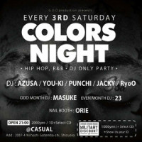 2/18-sat- Car Shop COLORS & G.O.D Present's "COLORS NIGHT" vol.159 OPEN 21:00 2,000yen/1Drink+1CD -Hip-Hop,R&B,Classics- -DJ- AZUSA(£Ç.£Ï.£Ä. Pro¡Ë YOU-KI(£Ç.£Ï.£Ä. Pro¡Ë MASUKE (Groove Junction) PUNCHI (HONEY LIP) Jacky (RED ILL) 21 (5ive Star) RyoO -NAIL BOOTH- ORIE